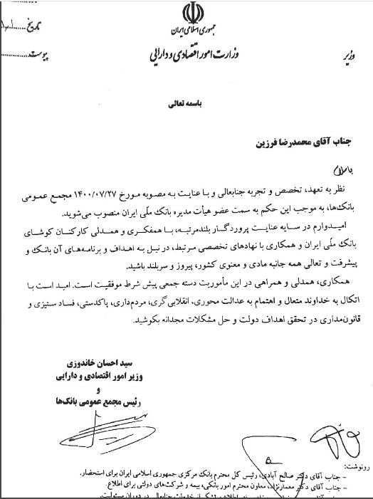 در حکم وزیر اقتصاد آمده است؛ نظر به تعهد، تخصص و تجربه جنابعالی و با مصوبه 27 مهرماه 1400 مجمع عمومی بانکها به موجب این حکم به سمت عضو هیأت مدیره بانک ملی ایران منصوب میشوید. امیدوارم در سایه عنایت پروردگار بلندمرتبه با همفکری و همدلی کارکنان کوشای بانک ملی ایران و همکاری با نهادهای تخصصی مرتبط در نیل به اهداف و برنامههای آن بانک و پیشرفت تعالیی همه جانبه مادی و معنوی کشور پیروز و سربلند باشید.