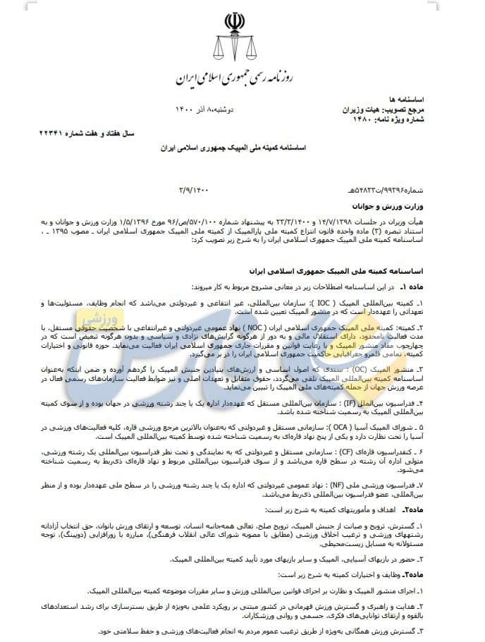 تیرماه سال گذشته، شورای نگهبان به برخی از مواد اساسنامه کمیته ایراداتی داشت که با نامهنگاریهای صورت گرفته از سوی کمیته ملی المپیک و همین طور دولت، بالاخره این اساسنامه تایید شد. اساسنامه کمیته ملی المپیک بعد از تایید در هیات اجرایی و مجمع عمومی 29 بهمن 1397 به کمیته بینالمللی المپیک (IOC) ارسال شده بود.
