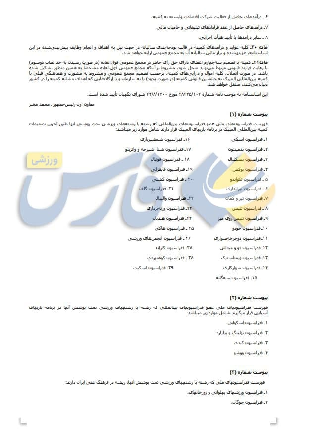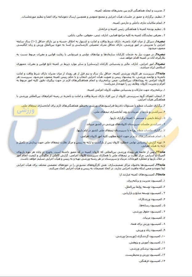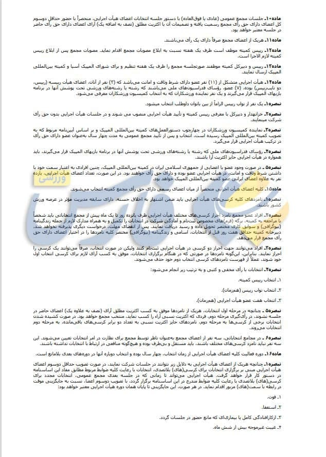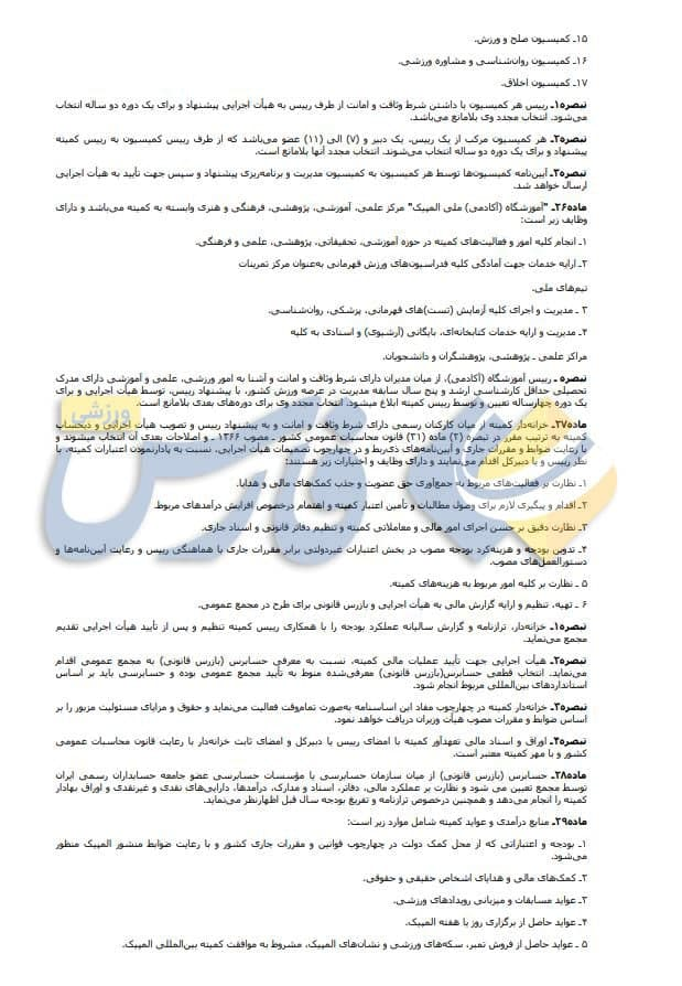 نکته قابل توجه دیگر مربوط به ماده 19 است که میگوید: خدمت رئیس، اعضای هیأت اجرایی و مجمع افتخاری بوده و شغل تلقی نمیشود. رئیس و اعضا وظایف و مسئولیتهای اجرایی به عهده نداشته و در قبال ارائه خدمات، حقوق دریافت نمیکنند اما پرداخت هزینههای سفر، اسکان و سایر هزینههای موجه در جهت انجام مأموریت محوله طبق ضوابط مقرر در آیین نامههای مالی و معاملاتی کمیته بلامانع است.