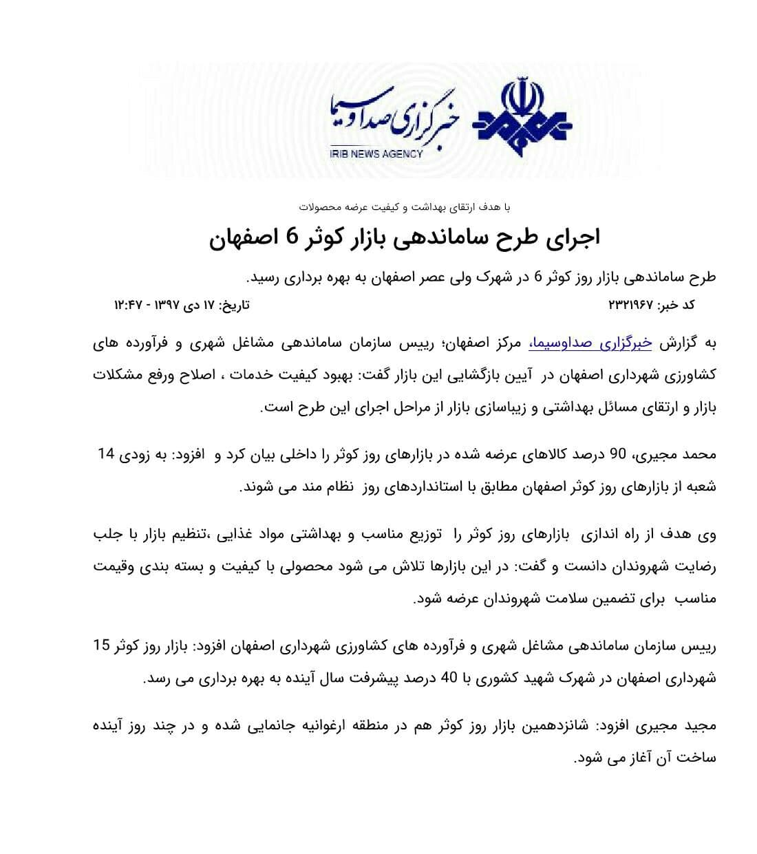 محمد مجیری، رئیس سازمان ساماندهی مشاغل شهری و فرآوردههای کشاورزی شهرداری اصفهان در ۱۷ دی ۹۷ با اشاره به این که بازار روز کوثر ۱۵ شهرداری اصفهان در شهرک شهید کشوری ۴۰ درصد پیشرفت داشته است، قول داد که در سال آینده، بازار کوثر این شهرک پرجمعیت به بهرهبرداری برسد، اما از آن تاریخ تاکنون، هنوز این بازار در شهرک شهید کشوری احداث و راهاندازی نشده است و تهیه مایحتاج اولیه برای مردم این شهرک در نزدیکترین فاصله ممکن، یکی از مشکلات اصلی آنها به حساب میآید.