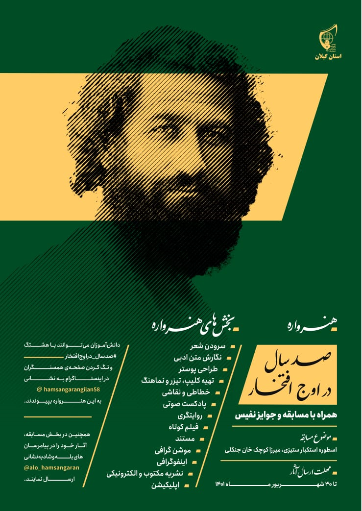 وی با گرامیداشت یاد و خاطره میرزا و نهضت جنگل گفت: به مناسبت یکصدمین سالگرد شهادت میرزاکوچک خان جنگلی و به منظور آشنایی بیشتر دانش آموزان با ابعاد شخصیتی و اهداف نهضت جنگل، هنرواره ملی «صد سال در اوج افتخار» برگزار میشود.