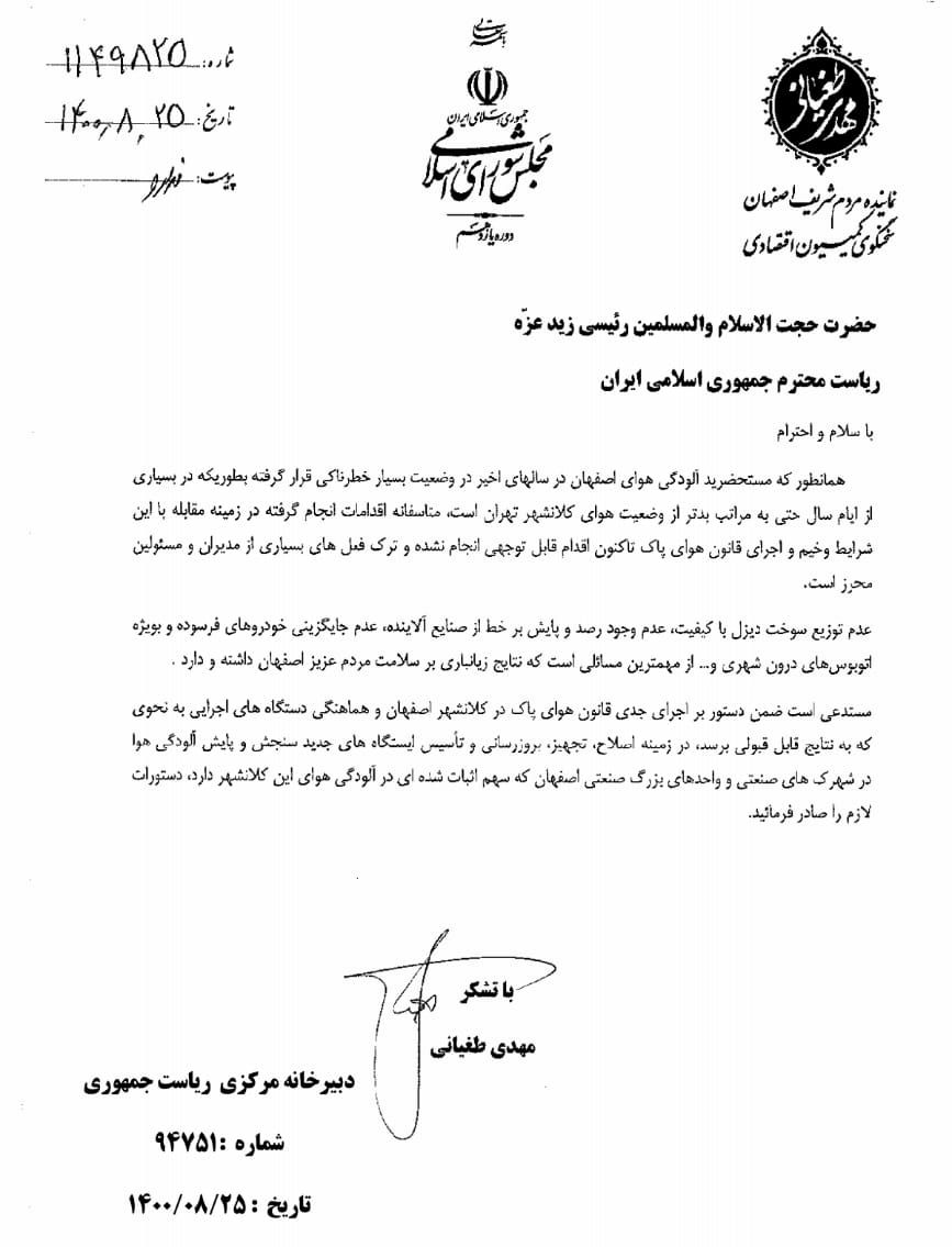 به گزارش خبرگزاری فارس از اصفهان، مهدی طغیانی نماینده مردم اصفهان در مجلس شورای اسلامی در نامهای خطاب به رئیس جمهور اظهار داشت: همانطور که مستحضرید آلودگی هوای اصفهان در سالهای اخیر در وضعیت بسیار خطرناکی قرار گرفته به طوری که در بسیاری از ایام سال حتی به مراتب بدتر از وضعیت هوای کلانشهر تهران است، متأسفانه اقدامات انجام گرفته در زمینه مقابله با این شرایط وخیم و اجرای قانون هوای پاک تاکنون اقدام قابل توجهی انجام نشده و ترک فعلهای بسیاری از مدیران و مسؤولان محرز است.