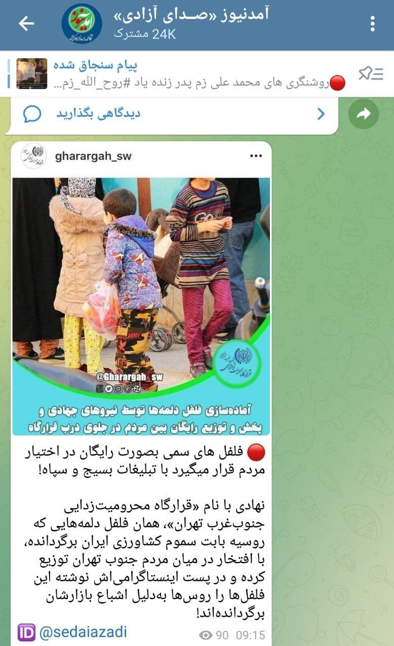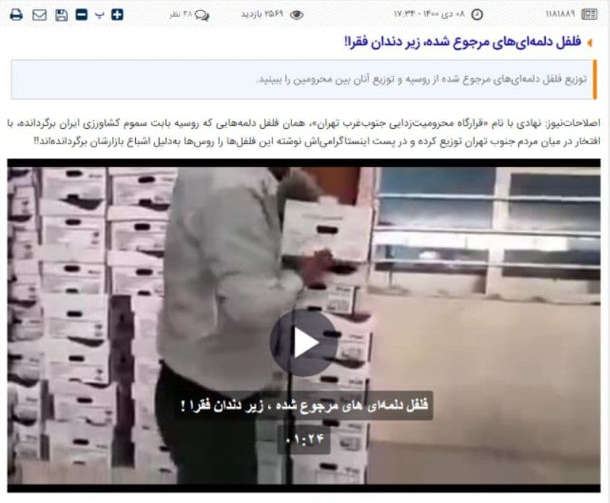 همچنین شبکه سعودی ایراناینترنشنال با انتشار گزارش کوتاهی ادعا کرد که قرارگاه محرومیتزدایی جنوب غرب تهران فلفلدلمهایهای صادراتی سمی را میان محرومان پخش کرده است.