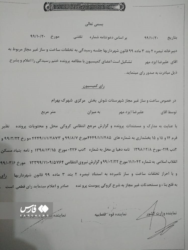 وی افزود: طبق قانون فرمانداری، دادستان و بنیاد مسکن به عنوان اعضای کمیسیون ماده 99 به این پرونده رسیدگی کردیم و رای صادر شد.