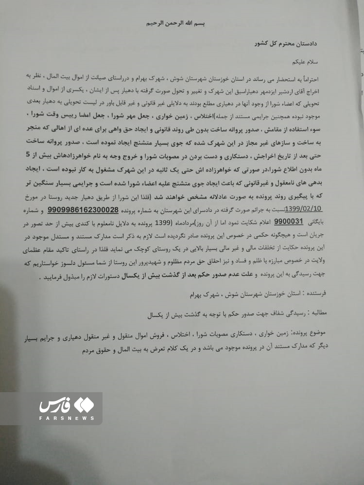 وی در ادامه گفت: علاوه بر این اعضای شورا از طریق دهیار جدید روستا در تاریخ 1399/02/10 نسبت به جرائم صورت گرفته در دادسرای این شهرستان به شماره پرونده 9909986162300028 و شماره بایگانی 9900031 اعلام شکایت کرد اما از آن تاریخ تا کنون روند پروند به کندی پیش میرود.