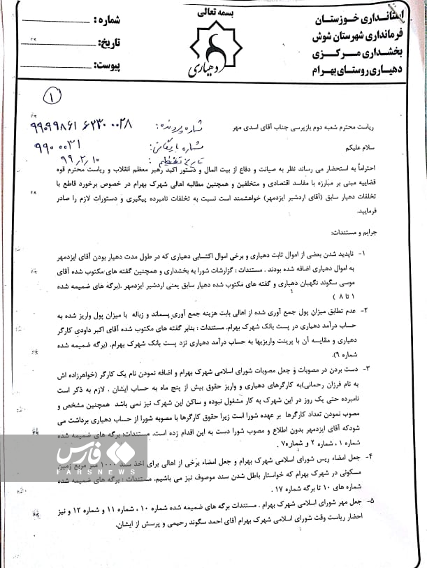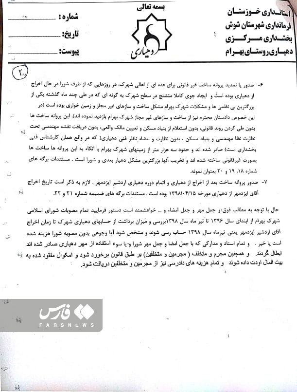 از طرفی با توجه به تخلفات صورت گرفته، تخریب ساخت و سازها و همچنین اخراج یکی از مسؤولین وقت به به دلیل اختلاس، جعل اسناد و امضا و … صادر شده است.