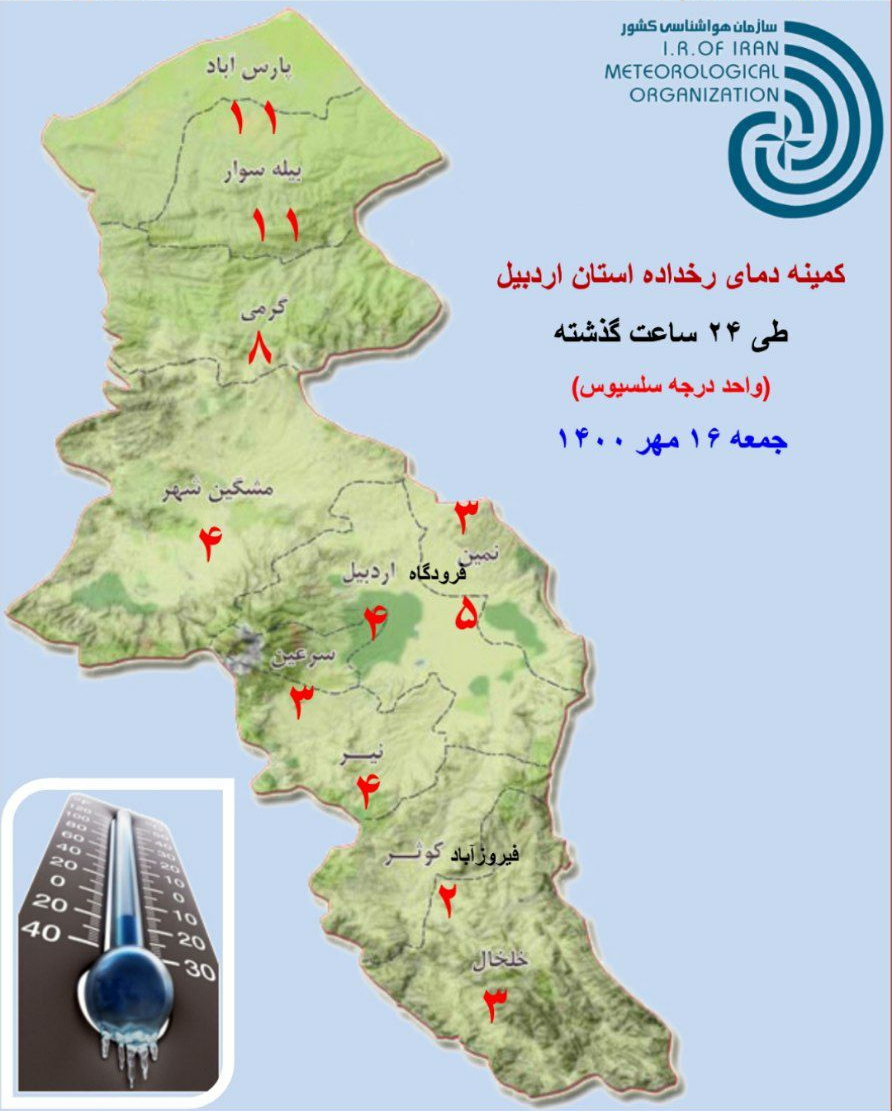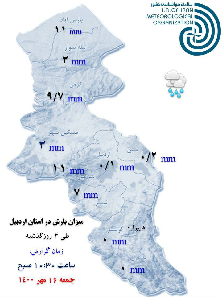 به گزارش خبرگزاری فارس از اردبیل، با فعالیت سامانه سرد و مرطوب خزری در استان طی چهار روز گذشته، بیشترین بارش باران در شهرستانهای پارس آباد و سرعین با ۱۱ میلیمتر به ثبت رسید.