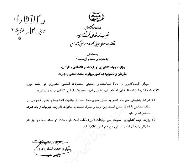 به گزارش خبرگزاری فارس، سید جواد ساداتی نژاد وزیر جهاد کشاورزی و رئیس «شورای قیمت گذاری و اتخاذ سیاستهای حمایتی محصولات اساسی کشاورزی»، مصوبه این شورا در خصوص مجاز بودن صادرات دام زنده غیر مولد از یک گمرک مشخص را به وزارت خانههای جهاد کشاورزی، صمت و اقتصاد و سازمان برنامه و بودجه ابلاغ کرد.