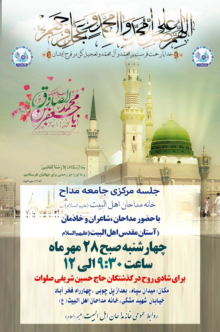این مراسم روز چهارشنبه ۲۸ مهرماه از ساعت ۹:۳۰ با حضور مداحان، شاعران و خادمان آستان مقدس اهل البیت(ع) برگزار خواهد شد.