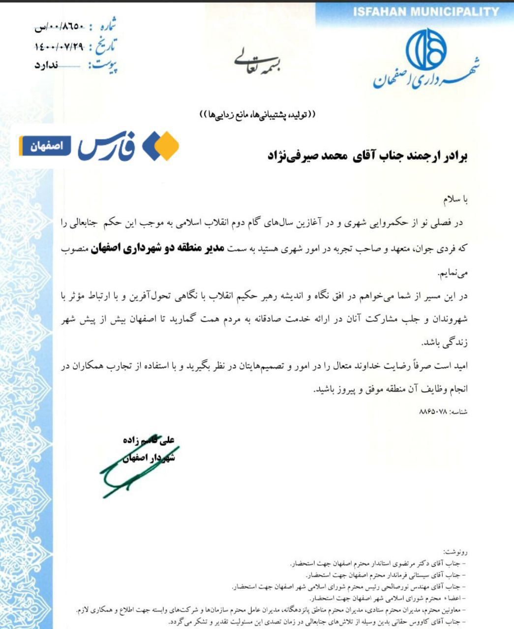 به گزارش خبرگزاری فارس از اصفهان، علی قاسمزاده شهردار اصفهان، در حکمی محمد صیرفینژاد را به عنوان مدیر منطقه ۲ شهرداری اصفهان منصوب کرد.