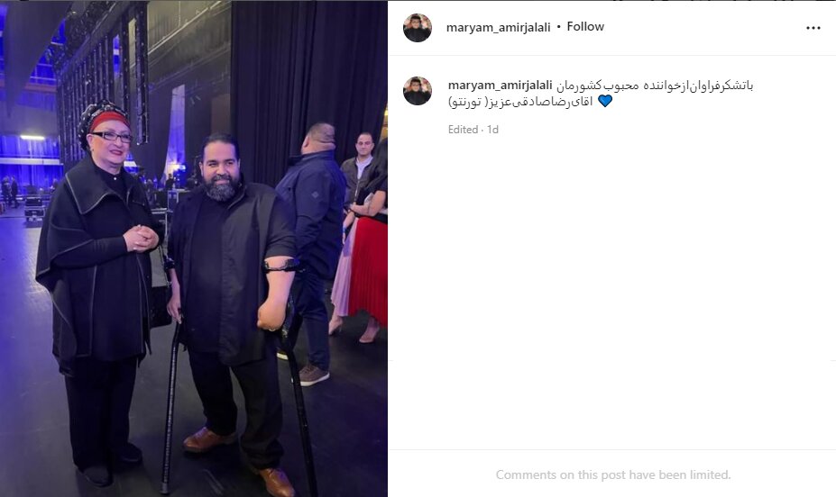 مریم امیرجلالی، بازیگر نیز که این روزها در کانادا به سر میبرد، با انتشار عکسی از خود در کنار رضا صادقی در صفحه اینستاگرامش چنین نوشت: «با تشکر فراوان از خواننده محبوب کشورمان، آقای رضا صادقی عزیز (تورنتو)»