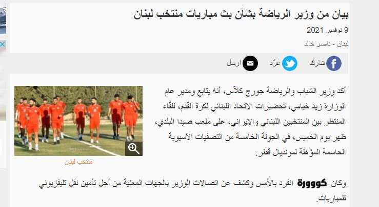 در همین زمینه جورج کلاس وزیر ورزش لبنان با انتشار بیانیه ای اعلام کرد که آنها برای حل مشکل پخش زنده دیدار تیم ملی این کشور با ایران وارد عمل شدند و به این موضوع به صورت جدی رسیدگی می کنند تا حل شود.