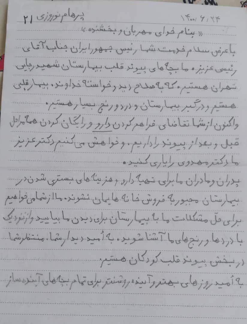 پرهام نوروزی دانشآموز کلاس ششم که شهریورماه ۱۴۰۰ در بیمارستان بستری بود به خاطر سختی شرایطش از جمله مشکلات دریافت دارو به رییسجمهور نامه نوشت. این نامه در صفحه اینستاگرام دکتر سیدمحمد مهدوی فوق تخصص قلب کودکان و بیماریهای پیچیده مادرزادی که به قول پرهام «فرستاده خدا برای مراقبت از بچهها است» منتشر شد و در نهایت به دست وزیر بهداشت رسید و دکتر بهرام عیناللهی دستور پیگیری موضوع توسط رییس دانشگاه علوم پزشکی همدان را صادر کرد.