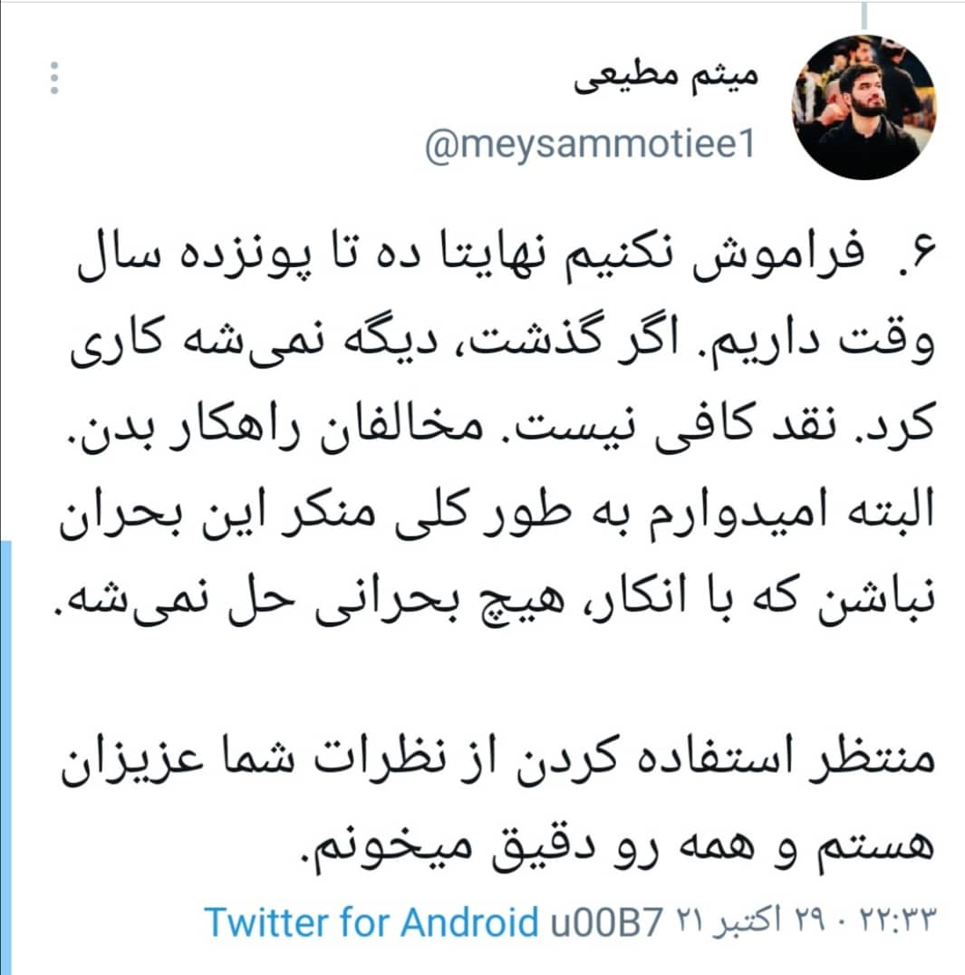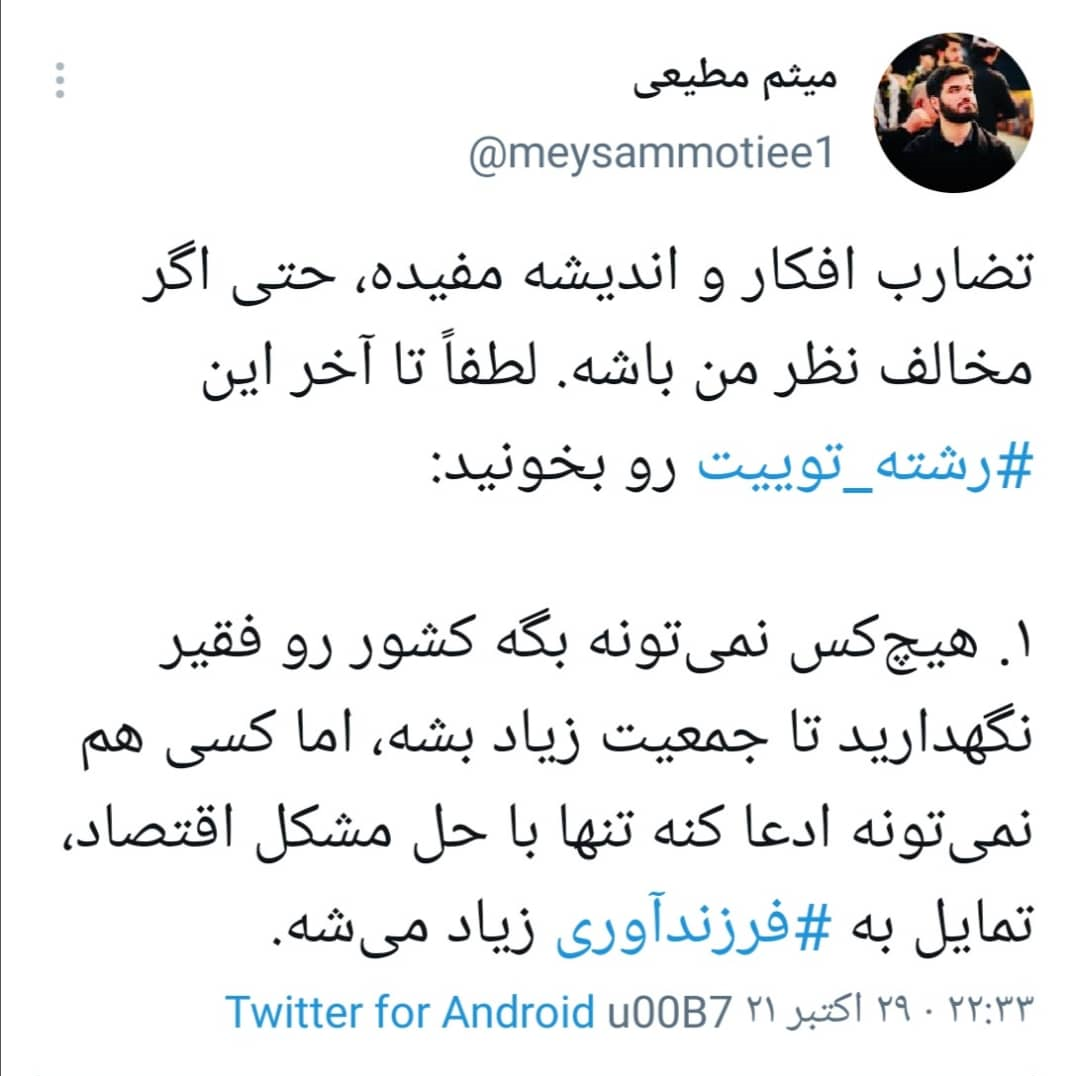 او در رشته توئیت دیگری نوشت: «تضارب افکار و اندیشه مفیده، حتی اگر مخالف نظر من باشه. لطفاً تا آخر این رشته توییت رو بخونید: