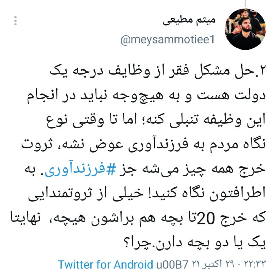 به گزارش خبرنگار حوزه مسجد و هیأت خبرگزاری فارس، میثم مطیعی مداح اهل بیت(ع) در یک رشته توئیت به موضوع فرزندآوری که توصیه مقام معظم رهبری در دیدار اخیر مداحان بود، پرداخت. او در این خصوص ۲ رشته توئیت منتشر کرده است.