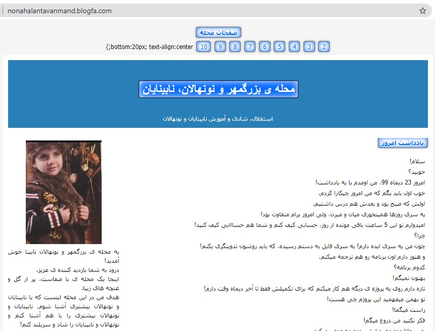 او هنگامی که دانش آموز کلاس پنجم ابتدایی بود وبلاگ خود را ساخت و در «محله بزرگمهر و نونهالان نابینا» سعی کرد در مطالبی را که به نظرش برای هم سن و سالهای نابینای خود مناسب است ارائه دهد و در این رابطه بیان میکند: در وبلاگ خودم سعی کردم آموزش کار با رایانه و همچنین آموزش برنامه «لیچز» که یک بستر مناسب برای انجام بازی شطرنج در فضای مجازی با هر بازیکنی در سراسر دنیاست را ارائه دهم و همچنین با ارائه گوشهای از خاطرات زندگی شخصیام قصد داشتم مخاطبانم را با دنیای یک نابینا که فرق چندانی با دنیای انسانهای بینا ندارد را نشان دهم.