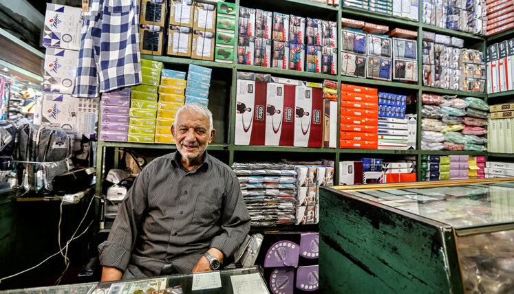 مرحوم عبدالله ملاباقر در فروشگاه پوشاک خود در بازار تهران