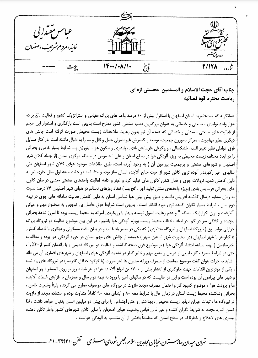 در ابتدای این نامه آمده است: همانگونه که مستحضرید استان اصفهان با استقرار بیش از ۱۰ درصد واحدهای بزرگ مقیاس و استراتژیک کشور و فعالیت بالغ بر ده هزار واحد تولیدی، صنعتی و خدماتی به عنوان بزرگترین قطب صنعتی کشور مطرح است، بدیهی است بارگذاری و استقرار این حجم از فعالیتهای صنعتی، معدنی و خدماتی که عمده آن نیز بدون رعایت ملاحظات زیست محیطی صورت گرفته است چالشهای دیگری نظیر مهاجرت، تمرکز ناموزون جمعیت، توسعه و گسترش غیراصولی حملونقل و… را به دنبال داشته است، در کنار مسایل فوق عواملی نظیر تغییر اقلیم، خشکسالی، توپوگرافی، فرسایش بادی، پایداری و سکون هوا، اینورژن و… شرایط بسیار خاص و بحرانی را در ابعاد مختلف زیست محیطی به ویژه آلودگی هوا در سطح استان و علیالخصوص در منطقه مرکزی استان (از جمله کلان شهر اصفهان و شهرهای صنعتی و پرجمعیت پیرامون آن) به وجود آورده است.