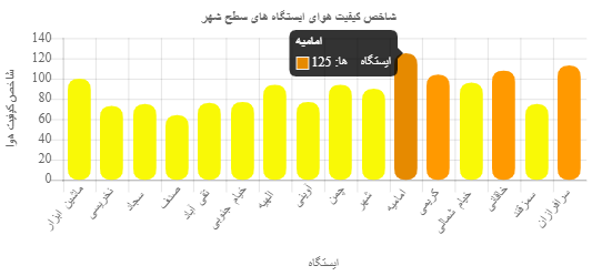 چهار ایستگاه سرافرازان، خاقانی، کریمی و امامیه در وضعیت نارنجی و ناسالم برای گروههای حساس هستند بطوری که منطقه امامیه با عدد شاخص ۱۲۵ بیشترین بار آلودگی را دارد.