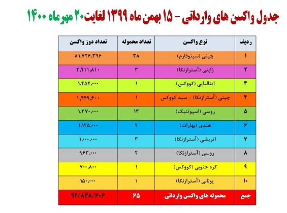 در حال حاضر 65 محموله بالغ بر 92 میلیون 848 هزار دوز انواع واکسن از کشورهای چین، ژاپن، ایتالیا، روسیه، هند، اتریش،کره جنوبی و یونان به کشور آمده است.