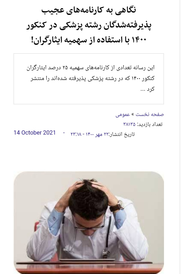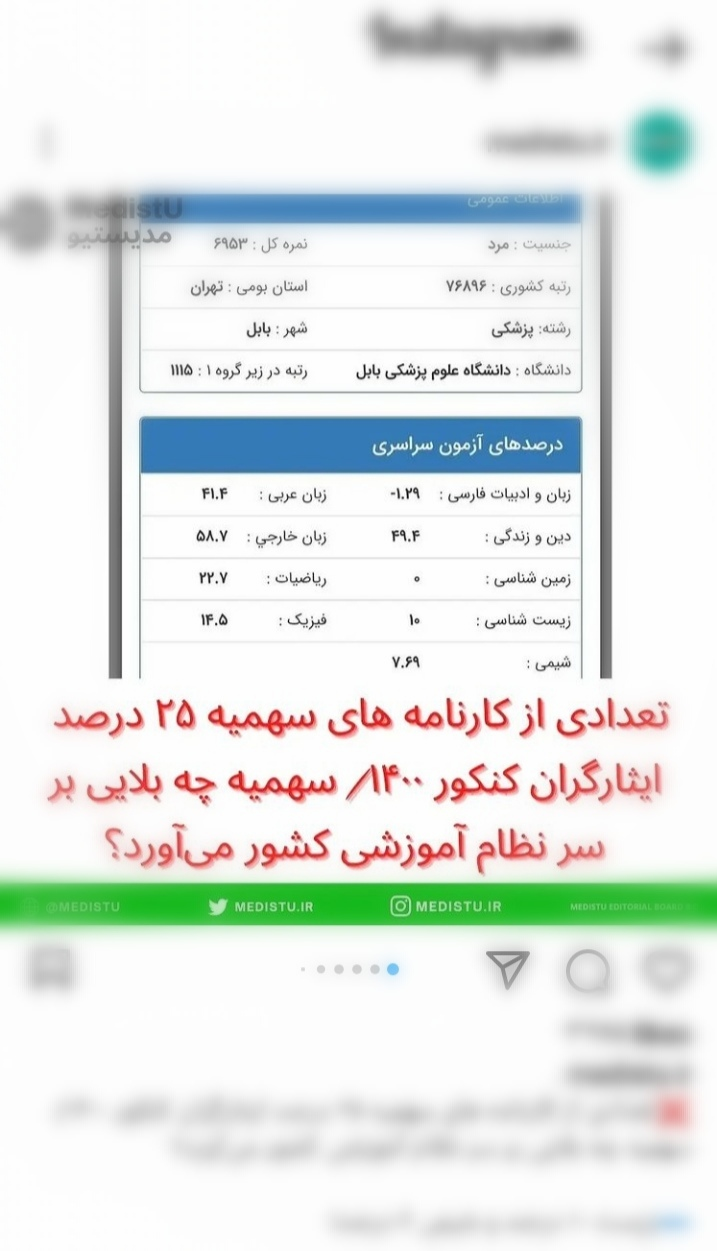 به گزارش گروه حماسه و مقاومت خبرگزاری فارس، در روزهای گذشته تصاویری با تیتر «کارنامههای عجیب پذیرفتهشدگان رشته پزشکی در کنکور ۱۴۰۰ با استفاده از سهمیه ایثارگران» در فضای مجازی منتشر شد و مخاطبان شبکههای مجازی واکنشهای متفاوتی نسبت به آن داشتند.