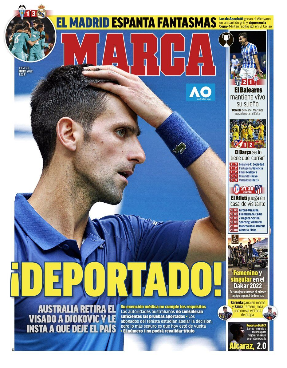 اما نشریه «مارکا» امروز تیتر یک خود را به دیپورت شدن ستاره صرب از مسابقات اوپن استرالیا اختصاص داد. این بازیکن بعد از بررسی های لازم از سوی ماموران استرالیا به دلیل نزدن واکسن کرونا ویزایش لغو شد و از این کشور باید خارج شود.