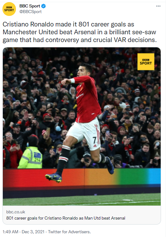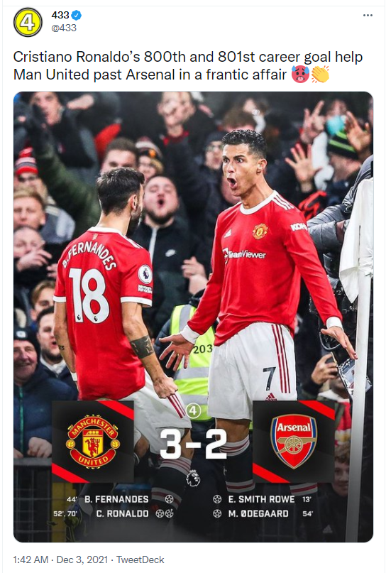 433: کمک رونالدو به منچستریونایتد مقابل آرسنال با گل 800 و 801 خود
