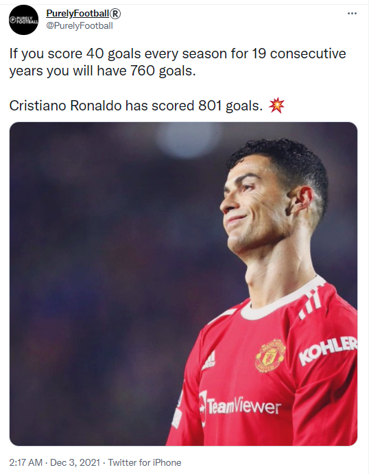 اگر شما 19 فصل متوالی، 40 گل بزنید، 760 گل به ثبت میرسد. رونالدو همین الان گل 801 خود را به ثمر رساند