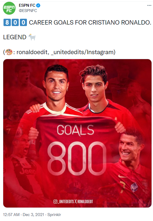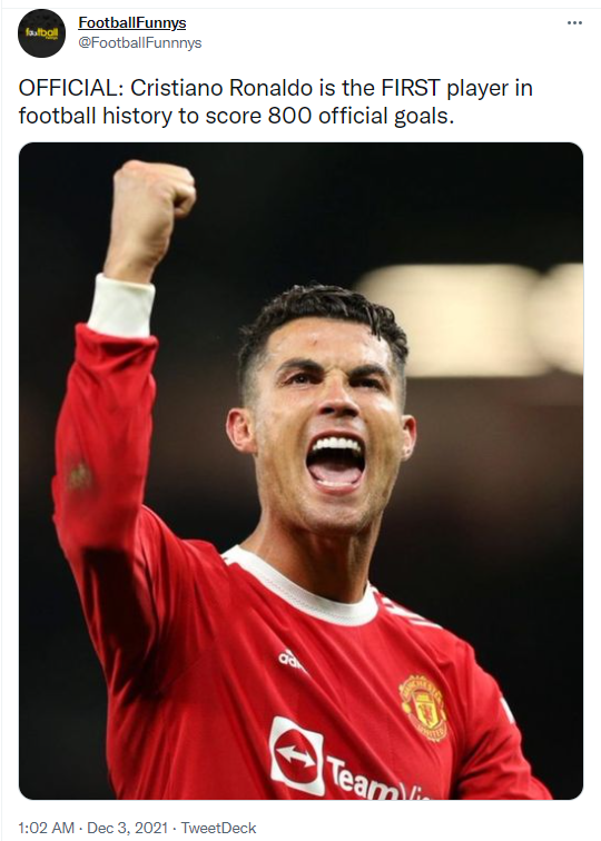 کریستیانو رونالدو اولین بازیکن تاریخ فوتبال است که بیش از 800 گل به ثمر رسانده
