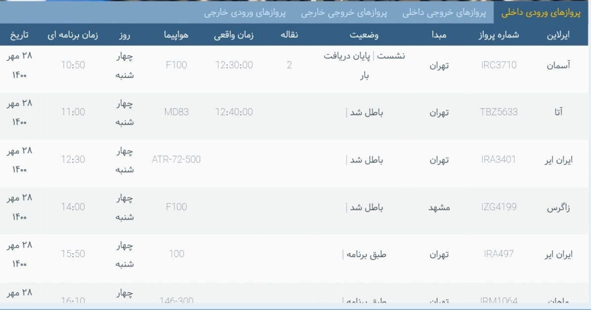 به گزارش خبرگزاری فارس از اردبیل، براساس تابلو اطلاعات پرواز فرودگاه اردبیل، بیشتر پروازهای ورودی و خروجی روز چهارشنبه(۲۸مهرماه۱۴۰۰) فرودگاه اردبیل بهدلیل مهگرفتگی و برودت هوا باطل شد.