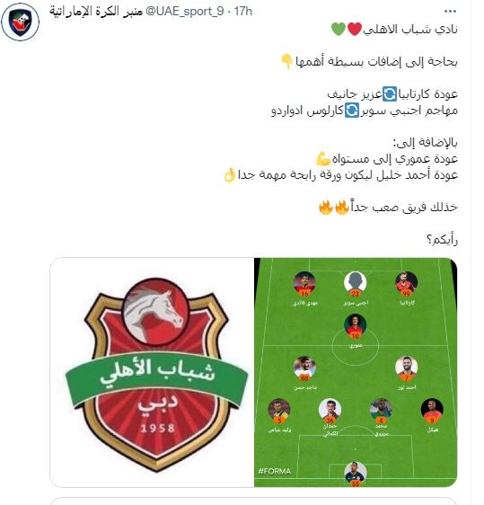 این رسانه نوشت: شباب الاهلی نیاز دارد تا کارتابیا آرژانتینی و عزیز جاینف ازبک به ترکیب تیمش برگردد. همچنین این تیم در کنار مهدی قائدی نیاز به جذب یک مهاجم خارجی طراز اول دارد تا جانشین اردواردوی برزیلی شود.