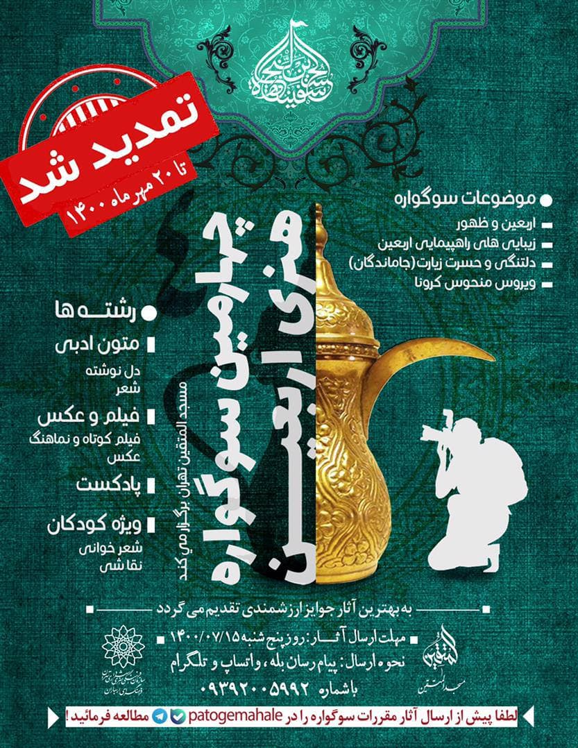 به گزارش خبرنگار قرآن و فعالیتهای دینی خبرگزاری فارس چهارمین سوگواره هنری اربعین با هدف معرفی این رویداد جهانی و گره زدن آن با مسئله ظهور حضرت حجت (عج) به وسیله زبان رسای هنر و با موضوعات «اربعین و ظهور»، «زیباییهای راهپیمایی اربعین»، «دلتنگی و حسرت جاماندگان» و «ویروس کرونا» به همت فرهنگسرای ارسباران و مسجدالمتقین تهران، برگزار میشود.