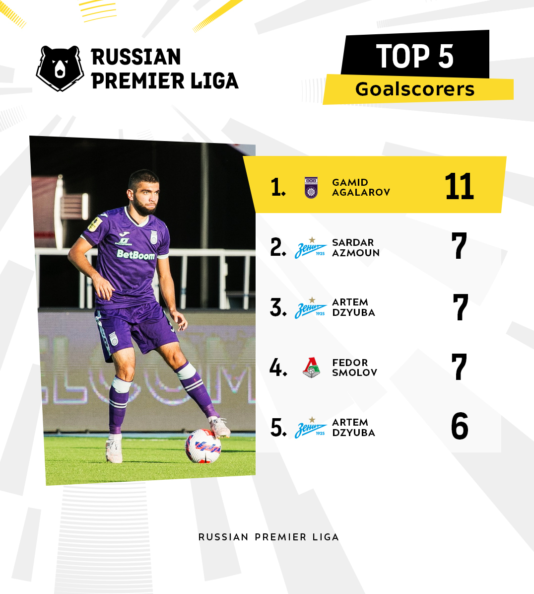 سردار آزمون ستاره تیم ملی کشورمان و عضو باشگاه زنیت با به ثمر رساندن 7 گل در رده دوم جدول بهترین گلزنان لیگ قرار گرفت.