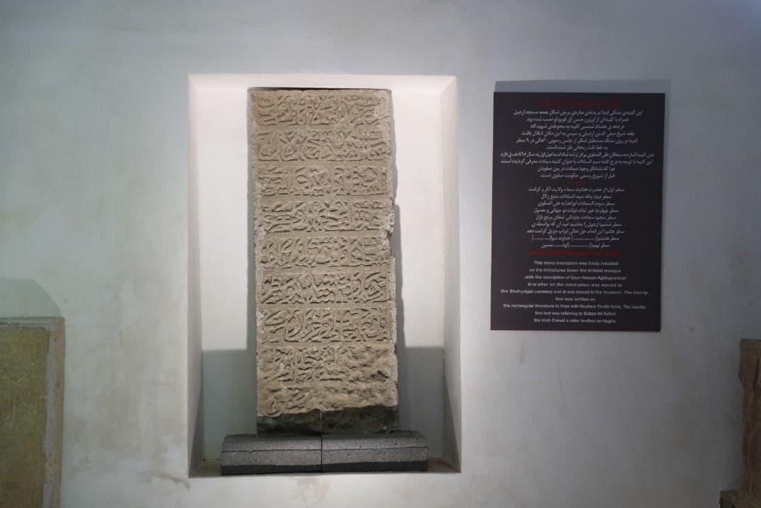 در این مجموعه، کتیبههای سنگی مربوط به دوران صفویان به نمایش گذاشته شده؛ یکی از این کتیبهها مربوط به مقبره مادر شاه اسماعیل صفوی است که با خط ثلث تزئین شده و مربوط به دوران شاه اسماعیل صفوی است.