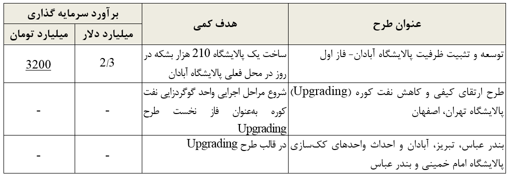 در ضمن، طرح ارتقای کیفی و کاهش نفت کوره (upgrading) پالایشگاههای تهران، اصفهان (شروع مراحل اجرایی واحد گوگردزدایی نفت کوره به عنوان فاز نخست طرح)، بندرعباس، تبریز، آبادان و احداث واحدهای ککسازی پالایشگاههای امام خمینی (ره) شازند اراک و بندرعباس(در قالب طرح upgrading) طراحی و درست اجرا میباشد که خلاصه آن در جدول زیرآمده است.
