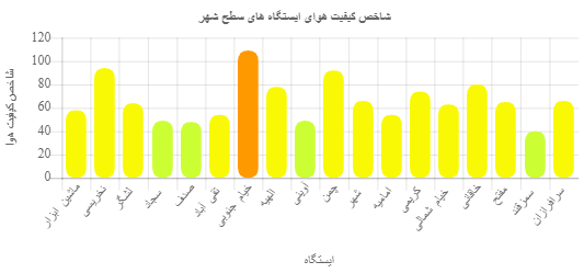 همانطور که در نمودار مشاهده میکنید ایستگاه خیامجنوبی با بیشترین بار آلودگی و عدد شاخص ۱۰۹ در وضعیت نارنجی و ناسالم برای گروههای حساس قرار دارد و چهار ایستگاه سمزقند، آوینی، صدف و سجاد با کمترین میزان آلایندههای جوی در شرایط سبز و پاک قرار گرفتهاند و هوا در سایر مناطق از شرایط قابل قبول برخوردار است.