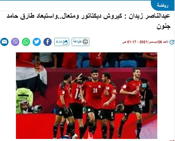 در جدیدترین خبر عبدالناصر زیدان یکی از خبرنگاران مطرح ورزشی مصر به شدت به کارلوس کی روش هجوم آورد او را «دیکتاتور» نامید.