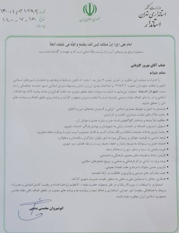 طی دو روز اخیر نیز با حکم استاندار تهران بهروز کاویانی شهردار سابق شهرهای شهریار، اندیشه و گلستان به عنوان شهردار دوره ششم مدیریت شهری اندیشه منصوب شد که پس از ۲ بار تجربه حضور کاویانی به عنوان شهردار اندیشه در دورههای سوم و پنجم، این سومین مرتبه است که وی به عنوان شهردار اندیشه منصوب میشود.
