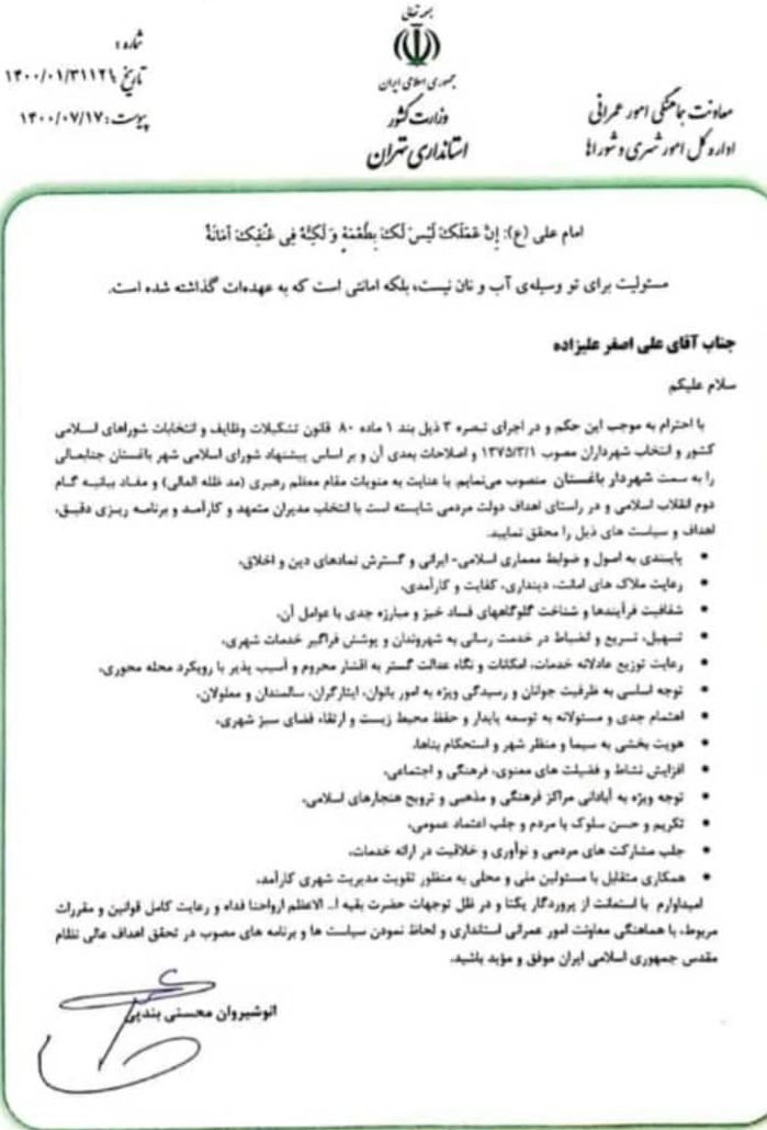 همچنین با حکم استاندار تهران علیاصغر علیزاده نیز به عنوان شهردار جدید شهر باغستان منصوب شد که سوابقی همچون کارشناس استانداری البرز و وزارت کشور در پروندههای شهرسازی، بازرس سازمان بازرسی کل کشور و سوابق مدیریتی در شهرداری اندیشه و شهرداری تنکمان( شهرستان نظرآباد استان البرز) را دارد که مدت ۶ ماه نیز به عنوان بازرس به شهرداری باغستان مأمور شده بود.