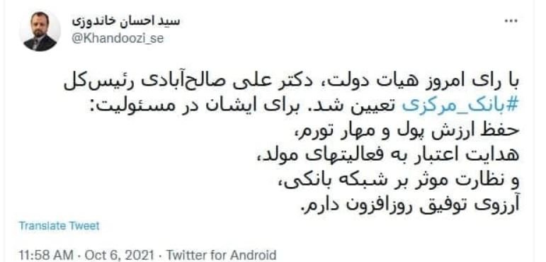 به گزارش خبرنگار اقتصادی خبرگزاری فارس، سید احسان خاندوزی پس از انتصاب علی صالح آبادی به سمت رئیس کل بانک مرکزی نوشت: