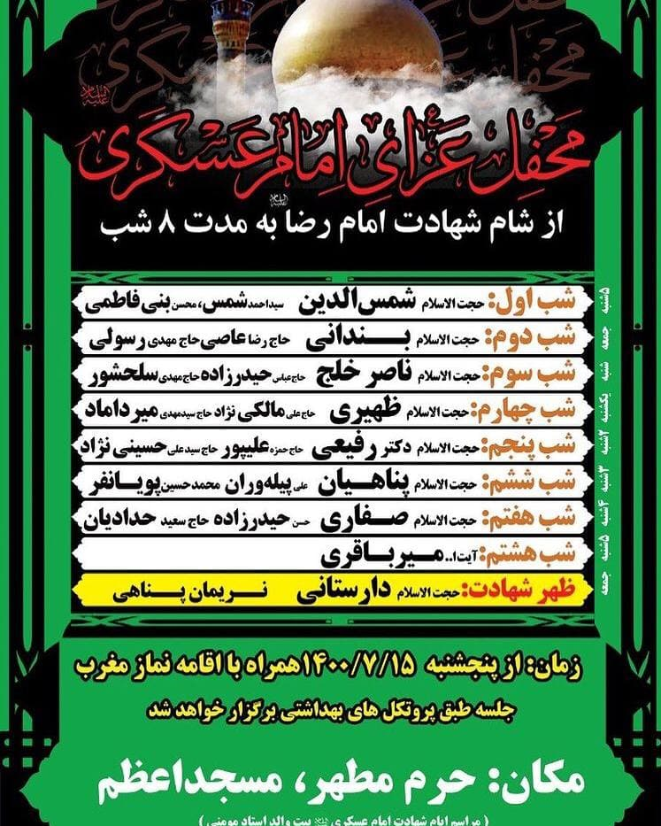 به گزارش خبرنگار حوزه مسجد و هیأت خبرگزاری فارس، محفل عزاداری شهادت امام حسن عسکری(ع) به مدت ۷ شب از امشب جمعه ۱۶ مهرماه در قم به میزبانی حجتالاسلام سیدحسین مومنی برگزار میشود.